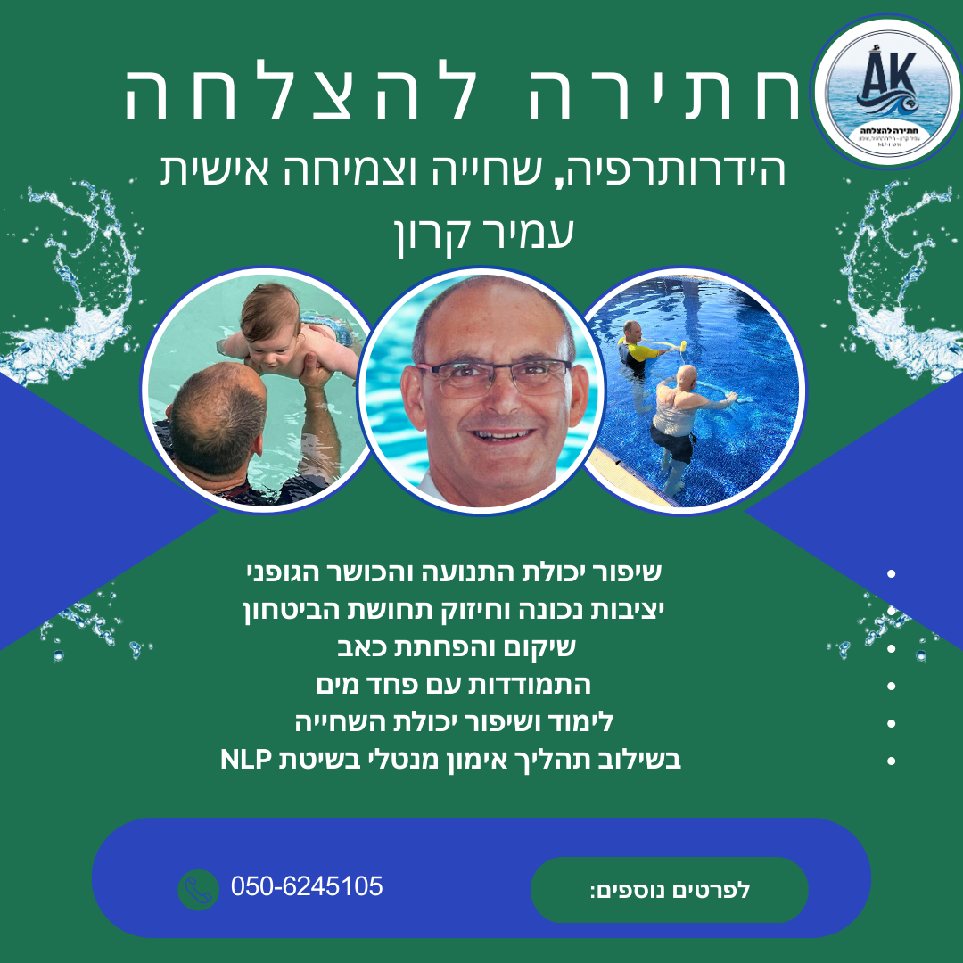 את האהבה הזו אני משלב עם עיסוק בתחום הטיפול כמטפל במים ( הידרותרפיה ) ושחייה שיקומית ולאפשר לכל אחת ואחד בכל גיל וגיל לשפר את מצבו האישי באמצעות טיפול במים חמים בבריכה טיפולית ובתוך כך: שיקום לאחר ניתוח, שיפור הכושר הגופני, הפחתת כאב, שיפור טווח תנועה, שיפור יכולת השחייה והסתגלות למים, התמודדות עם חרדת מים ועוד.